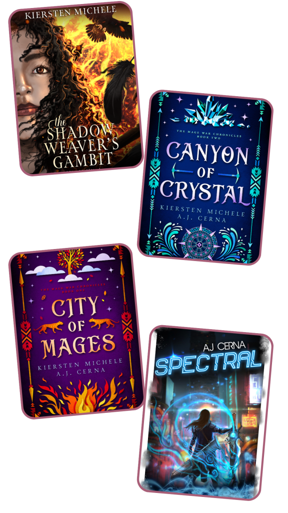 - Kiersten Michele currently has two novels to her credit: City of Mages (YA Epic Fantasy) and The Shadow Weaver’s Gambit (YA Romantic Fantasy), both of which take place in their Latin-inspired Mage World. Her third book, Canyon of Crystal is the second book of the Mage War Chronicles, and her first sequel!